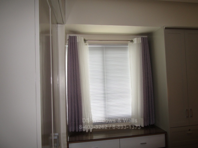 The narrow depth of the venetian blinds also allowed the roller blinds to be installed along side it (as seen on top). So if the client wants to really eliminate the light outside, then he can just close the roller blinds in addition to the venetian blinds at the back. Another good example is the photo below, where the narrow depth of the mini blinds allowed curtains to be installed on its front which by the way looks really good.